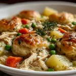 This pot pie balances homey flavors with practical benefits. It’s quick if you already have cooked chicken on hand, budget-friendly, and flexible — switch potatoes for sweet potatoes or swap biscuits for a pie crust. It’s ideal for weeknight dinners, casual Sunday suppers, or when you want to send someone a comforting meal.