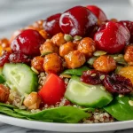 I first made this spinach and quinoa salad on a hot July evening when I wanted something bright, filling, and fridge-friendly. It’s a hearty bowl of fluffy quinoa, tender spinach, tart dried cherries, and sautéed chickpeas with a tangy yogurt‑lemon dressing — a recipe that works as a light dinner, a potluck centerpiece, or a make‑ahead lunch. The textures and sweet‑tart notes keep it interesting, and it’s easy to scale up when you need to feed a crowd.