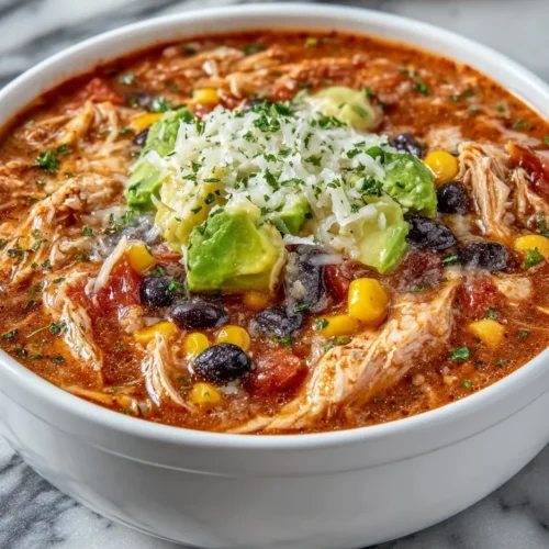 - Finish and serve: taste and adjust seasoning, then ladle into bowls and top with shredded cheese, diced avocado, cilantro, and crushed tortilla chips.