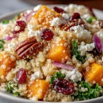 I make this Fall Quinoa Salad all through crisp-weather months — it’s the kind of bowl that tastes like a cozy sweater: warm roasted sweet potato, tart cranberries, crunchy pecans and bright greens all tossed with a maple–apple-cider vinaigrette. It works as a weeknight main, a potluck side or a make-ahead lunch, and it’s sturdy enough to travel to a picnic. If you like seasonal salads that hold up (and improve) after a chill in the fridge, this one’s for you — and it pairs surprisingly well with a fruit-forward side like fall fruit salad for a full harvest-table spread.