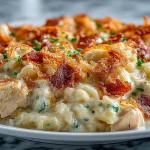 This casserole checks so many boxes: minimal prep, pantry-friendly ingredients, and the sweet-savory punch of French onion flavor without simmering onions for hours. It’s great for busy weeknights, potlucks, and anyone who appreciates a crunchy topping on a creamy base. Using refrigerated French onion dip gives you depth of flavor instantly, while canned cream of chicken keeps the texture silky.
