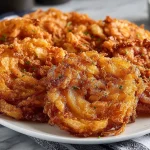- Fry in batches: Working in small batches to avoid crowding, drop a handful of coated onions into the oil. Fry 1–2 minutes, stirring gently, until golden brown and lacy. Maintain 375°F; if it dips, wait for the oil to recover before the next batch.
