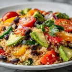 This salad is one of those rare recipes that’s fast, nutritious, and adaptable. Quinoa brings a complete plant-based protein and a pleasant nuttiness, while black beans add creaminess and fiber. The bell pepper and cherry tomatoes keep things crisp and juicy, and avocado softens the bite with healthy fats. It’s budget-friendly, naturally gluten-free, and works for meal prep or last-minute entertaining.