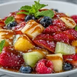 - Flexible: Works with berries, stone fruits, melon, or tropical mixes (I often drizzle it over a peach salad like this one: Refreshing Peach Fruit Salad).