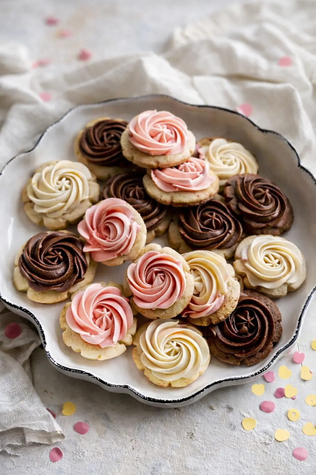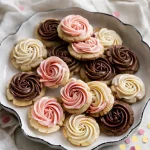 This recipe starts with one simple spritz cookie dough. From there, you divide it into portions to create strawberry and chocolate variations. Each dough is piped into rose shapes, baked quickly, and then sandwiched together with a marshmallow buttercream that stays soft and creamy.